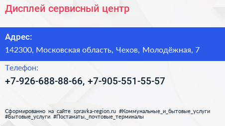 Дисплей, сервисный центр по адресу 142300, Московская область, Чехов, Молодёжная, 7 в дальнейшем Организация, размещена в следующих категориях: