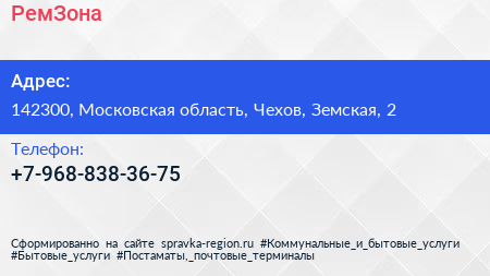 РемЗона по адресу 142300, Московская область, Чехов, Земская, 2 в дальнейшем Организация, размещена в следующих категориях: