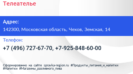 Телеателье по адресу 142300, Московская область, Чехов, Земская, 14 в дальнейшем Организация, размещена в следующих категориях: