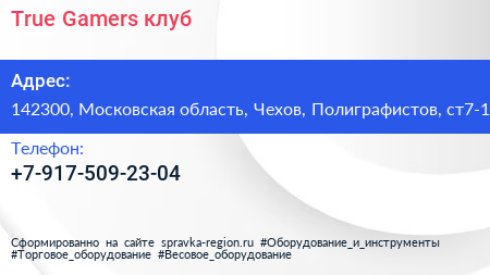 True Gamers, клуб по адресу 142300, Московская область, Чехов, Полиграфистов, ст7-1 в дальнейшем Организация, размещена в следующих категориях: