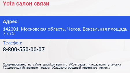 Yota, салон связи по адресу 142301, Московская область, Чехов, Вокзальная площадь, 7 ст5 в дальнейшем Организация, размещена в следующих категориях: