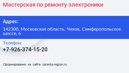 Мастерская по ремонту электроники по адресу 142300, Московская область, Чехов, Симферопольское шоссе, 6 в дальнейшем Организация, размещена в следующих категориях: