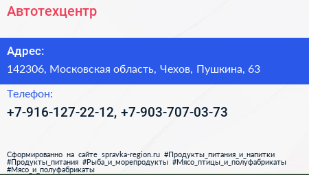 Автотехцентр по адресу 142306, Московская область, Чехов, Пушкина, 63 в дальнейшем Организация, размещена в следующих категориях: