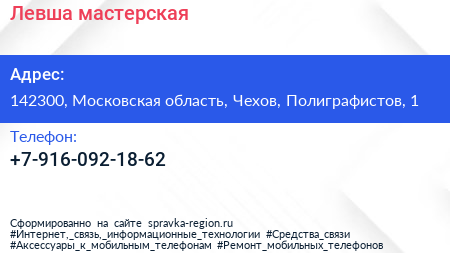 Левша, мастерская по адресу 142300, Московская область, Чехов, Полиграфистов, 1 в дальнейшем Организация, размещена в следующих категориях: