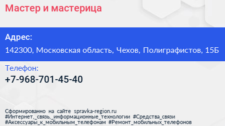 Мастер и мастерица по адресу 142300, Московская область, Чехов, Полиграфистов, 15Б в дальнейшем Организация, размещена в следующих категориях: