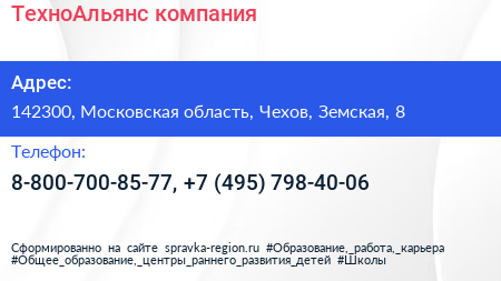 ТехноАльянс, компания по адресу 142300, Московская область, Чехов, Земская, 8 в дальнейшем Организация, размещена в следующих категориях: