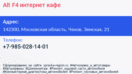 Alt+F4, интернет-кафе по адресу 142300, Московская область, Чехов, Земская, 21 в дальнейшем Организация, размещена в следующих категориях: