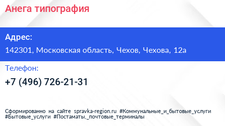 Анега, типография по адресу 142301, Московская область, Чехов, Чехова, 12а в дальнейшем Организация, размещена в следующих категориях: