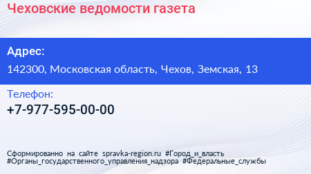 Чеховские ведомости, газета по адресу 142300, Московская область, Чехов, Земская, 13 в дальнейшем Организация, размещена в следующих категориях:
