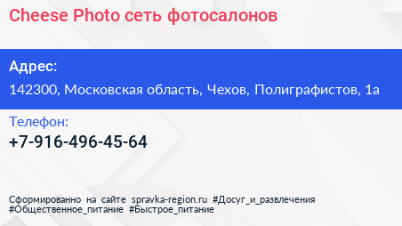 Cheese-Photo, сеть фотосалонов по адресу 142300, Московская область, Чехов, Полиграфистов, 1а в дальнейшем Организация, размещена в следующих категориях:
