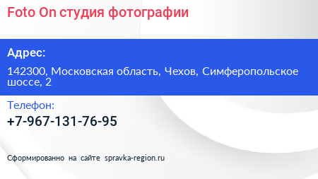 Foto`On, студия фотографии по адресу 142300, Московская область, Чехов, Симферопольское шоссе, 2 в дальнейшем Организация, размещена в следующих категориях:
