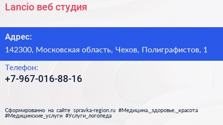 Lancio, веб-студия по адресу 142300, Московская область, Чехов, Полиграфистов, 1 в дальнейшем Организация, размещена в следующих категориях: