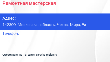 Ремонтная мастерская по адресу 142300, Московская область, Чехов, Мира, 9а в дальнейшем Организация, размещена в следующих категориях:
