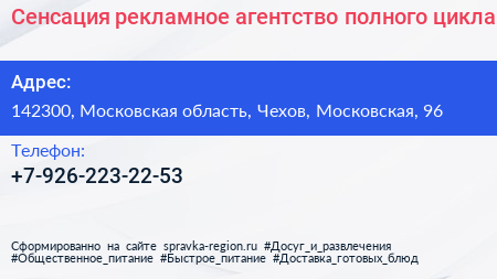 Сенсация, рекламное агентство полного цикла по адресу 142300, Московская область, Чехов, Московская, 96 в дальнейшем Организация, размещена в следующих категориях: