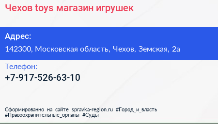 Чехов-toys, магазин игрушек по адресу 142300, Московская область, Чехов, Земская, 2а в дальнейшем Организация, размещена в следующих категориях: