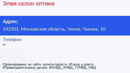 Элви, салон оптики по адресу 142301, Московская область, Чехов, Чехова, 10 в дальнейшем Организация, размещена в следующих категориях: