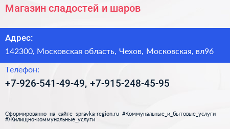 Магазин сладостей и шаров по адресу 142300, Московская область, Чехов, Московская, вл96 в дальнейшем Организация, размещена в следующих категориях: