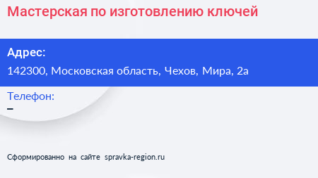 Мастерская по изготовлению ключей по адресу 142300, Московская область, Чехов, Мира, 2а в дальнейшем Организация, размещена в следующих категориях: