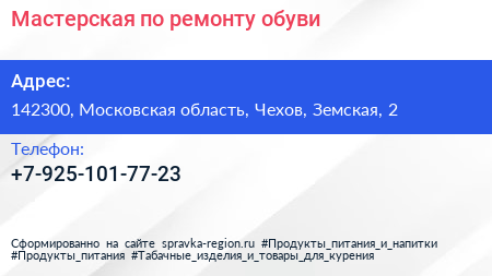 Мастерская по ремонту обуви по адресу 142300, Московская область, Чехов, Земская, 2 в дальнейшем Организация, размещена в следующих категориях: