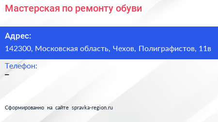 Мастерская по ремонту обуви по адресу 142300, Московская область, Чехов, Полиграфистов, 11в в дальнейшем Организация, размещена в следующих категориях: