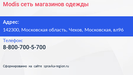 Modis, сеть магазинов одежды по адресу 142300, Московская область, Чехов, Московская, вл96 в дальнейшем Организация, размещена в следующих категориях: