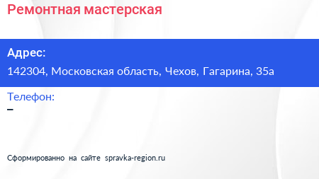 Ремонтная мастерская по адресу 142304, Московская область, Чехов, Гагарина, 35а в дальнейшем Организация, размещена в следующих категориях: