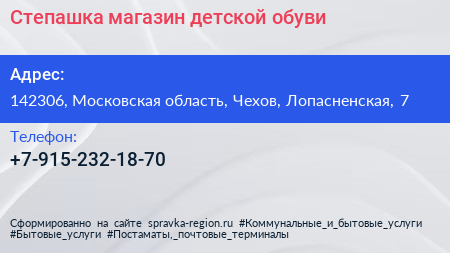 Степашка, магазин детской обуви по адресу 142306, Московская область, Чехов, Лопасненская, 7 в дальнейшем Организация, размещена в следующих категориях: