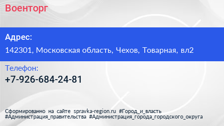 Военторг по адресу 142301, Московская область, Чехов, Товарная, вл2 в дальнейшем Организация, размещена в следующих категориях: