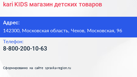 kari KIDS, магазин детских товаров по адресу 142300, Московская область, Чехов, Московская, 96 в дальнейшем Организация, размещена в следующих категориях: