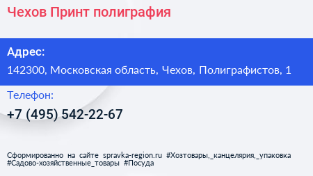 Чехов-Принт, полиграфия по адресу 142300, Московская область, Чехов, Полиграфистов, 1 в дальнейшем Организация, размещена в следующих категориях: