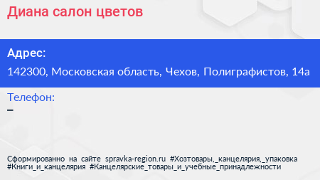 Диана, салон цветов по адресу 142300, Московская область, Чехов, Полиграфистов, 14а в дальнейшем Организация, размещена в следующих категориях: