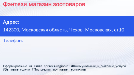Фэнтези, магазин зоотоваров по адресу 142300, Московская область, Чехов, Московская, ст10 в дальнейшем Организация, размещена в следующих категориях: