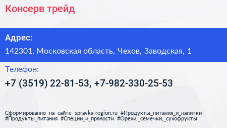 Консерв-трейд по адресу 142301, Московская область, Чехов, Заводская, 1 в дальнейшем Организация, размещена в следующих категориях: