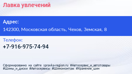Лавка увлечений по адресу 142300, Московская область, Чехов, Земская, 8 в дальнейшем Организация, размещена в следующих категориях: