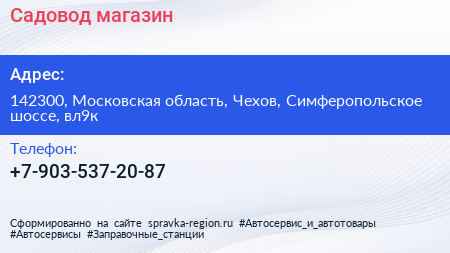 Садовод, магазин по адресу 142300, Московская область, Чехов, Симферопольское шоссе, вл9к в дальнейшем Организация, размещена в следующих категориях:
