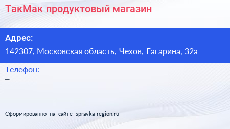 ТакМак, продуктовый магазин по адресу 142307, Московская область, Чехов, Гагарина, 32а в дальнейшем Организация, размещена в следующих категориях: