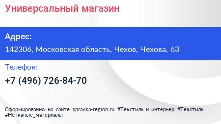 Универсальный магазин по адресу 142306, Московская область, Чехов, Чехова, 63 в дальнейшем Организация, размещена в следующих категориях: