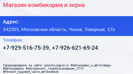 Магазин комбикорма и зерна по адресу 142301, Московская область, Чехов, Товарная, 17а в дальнейшем Организация, размещена в следующих категориях: