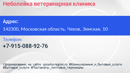 Неболейка, ветеринарная клиника по адресу 142300, Московская область, Чехов, Земская, 10 в дальнейшем Организация, размещена в следующих категориях: