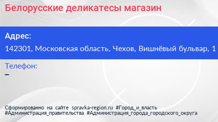 Белорусские деликатесы, магазин по адресу 142301, Московская область, Чехов, Вишнёвый бульвар, 1 в дальнейшем Организация, размещена в следующих категориях: