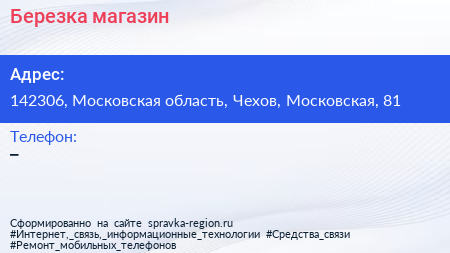 Березка, магазин по адресу 142306, Московская область, Чехов, Московская, 81 в дальнейшем Организация, размещена в следующих категориях: