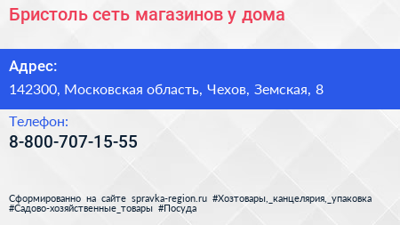 Бристоль, сеть магазинов у дома по адресу 142300, Московская область, Чехов, Земская, 8 в дальнейшем Организация, размещена в следующих категориях: