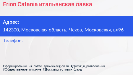 Erion Catania, итальянская лавка по адресу 142300, Московская область, Чехов, Московская, вл96 в дальнейшем Организация, размещена в следующих категориях: