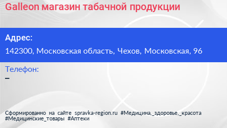 Galleon, магазин табачной продукции по адресу 142300, Московская область, Чехов, Московская, 96 в дальнейшем Организация, размещена в следующих категориях: