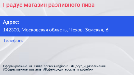 Градус, магазин разливного пива по адресу 142300, Московская область, Чехов, Земская, 6 в дальнейшем Организация, размещена в следующих категориях: