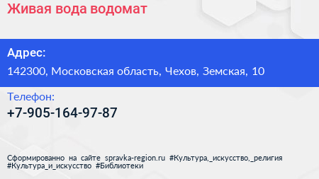 Живая вода, водомат по адресу 142300, Московская область, Чехов, Земская, 10 в дальнейшем Организация, размещена в следующих категориях:
