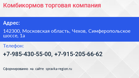 Комбикормов, торговая компания по адресу 142300, Московская область, Чехов, Симферопольское шоссе, 1а в дальнейшем Организация, размещена в следующих категориях: