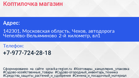 Коптилочка, магазин по адресу 142301, Московская область, Чехов, автодорога Чепелёво-Вельяминово 2-й километр, вл1 в дальнейшем Организация, размещена в следующих категориях: