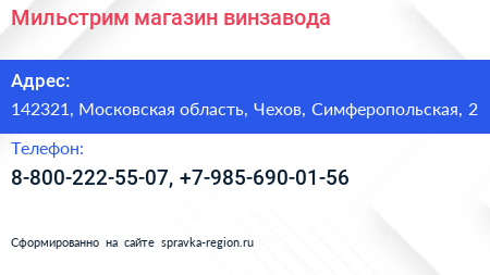 Мильстрим, магазин винзавода по адресу 142321, Московская область, Чехов, Симферопольская, 2 в дальнейшем Организация, размещена в следующих категориях: