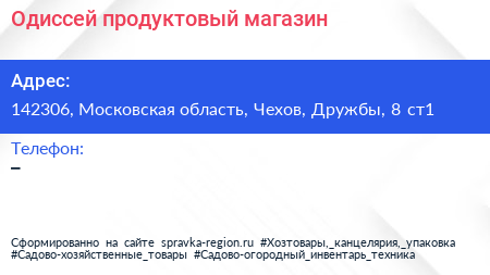 Одиссей, продуктовый магазин по адресу 142306, Московская область, Чехов, Дружбы, 8 ст1 в дальнейшем Организация, размещена в следующих категориях: